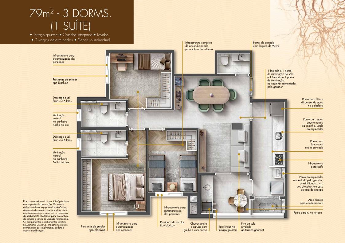Descubra o equilíbrio ideal entre praticidade e aconchego no Apartamento de 3 dormitórios ,uma planta funcional de 79,9m², pensada para atender às necessidades da vida moderna com elegância e eficiência.